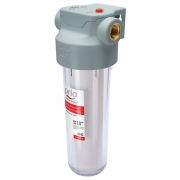 Прозрачный корпус, высота 10", кнопка сброса давления, присоединительные размеры ½", латунные вставки, волокно-наполненная армированная крышка, поликарбонатная небьющаяся колба, установленный картридж K100