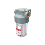 Прозрачный корпус, высота 5", кнопка сброса давления, присоединительные размеры ½", латунные вставки, волокно-наполненная армированная крышка, поликарбонатная небьющаяся колба, установленный картридж K110